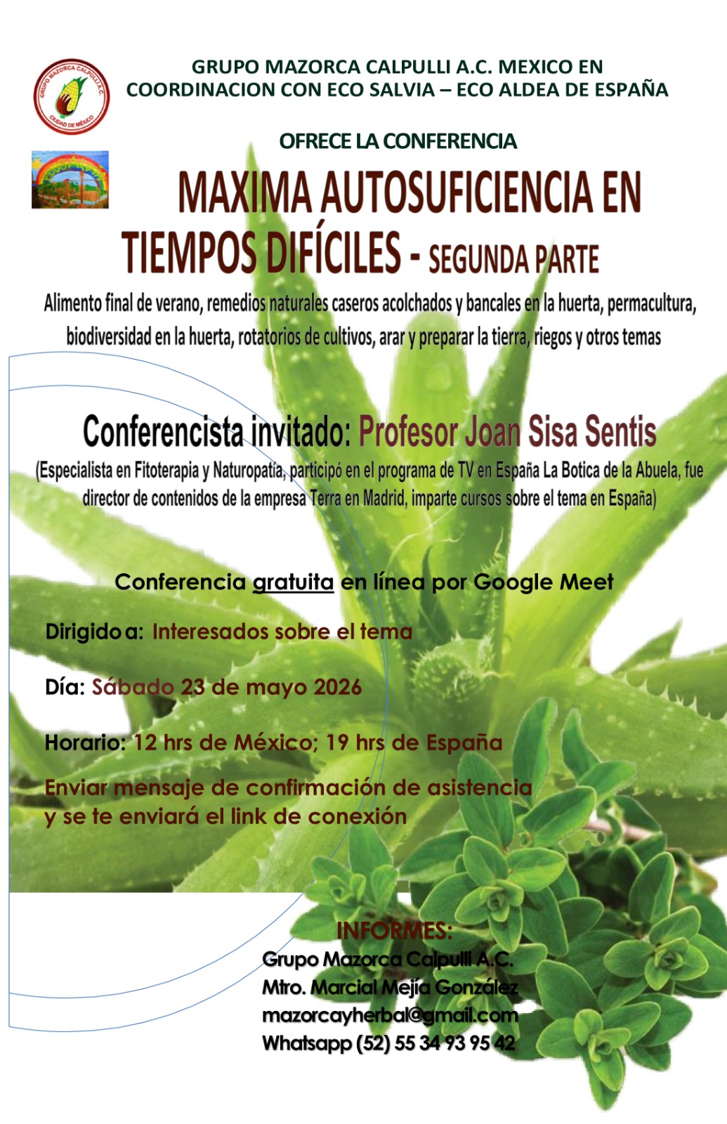 El día 24 de marzo de este 2026 tuve el honor de impartir una conferencia sobre la máxima autosuficiencia en tiempos difíciles organizada por Marcial Mejía, profesor en la universidad de Morelos, México. Tuvimos una asistencia de 50 personas conectadas y con mucho interés participativo. Se creó un vínculo especial entre México y España sobre todo en lo relacionado con la autosuficiencia y la creación de ecoaldeas, comunidades y proyectos con la tierra. Muy pronto tenemos previsto organizar una segunda conferencia con el mismo tema ya que nos quedaron muchas cosas interesantes para compartir.