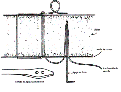 En las antiguas casas de Nebraska, se colocaban listones de madera para que el estuco se pudiera clavar. En nuestros tiempos, en vez de un cable, se utiliza bramante, que es más fácil de manejar que el hierro. John Parson, de Rimrock, Arizona, desarrolló un sistema eficiente para adherir la malla de estuco a la paja de la casa de fardos.