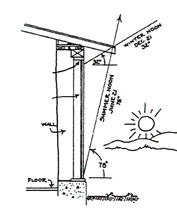 Para medir correctamente un alero, hay que calcular lo que se conoce como “ángulo solar mediodía de invierno” y el “ángulo solar del mediodía de verano”. (Mediodía de invierno =90º menos la latitud, menos la declinación. Mediodía de verano =90º menos la latitud, más la declinación.) Dibujar una sección transversal de la pared orientada al sur que muestre la localización del cristal en la pared. Proyectar el ángulo del mediodía de verano desde la base de la cristalera y después el ángulo del mediodía de invierno desde la parte superior de la cristalera. El punto de intersección de los dos ángulos es el punto final del alero.