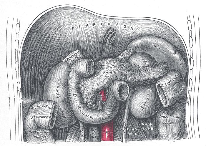 intestinales ambos esbozos se unen formando un páncreas único. Posee una compleja irrigación desde la aorta abdominal.