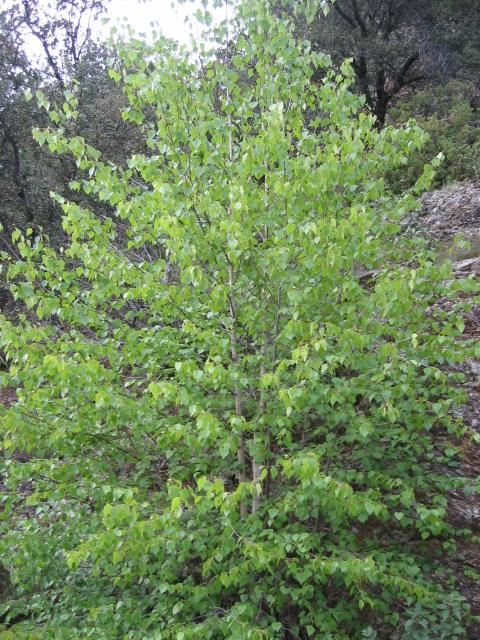 Su copa es estrecha y sus ramas ascendentes redodeándose. Su corteza aunque es de color marrón brillante se va volviendo poco a poco de color blanco con surcos de color negro. Su hojas son triangulares con la base redondeada y márgenes dentados. Las flores van formando racimos colgados que poseen los frutos.