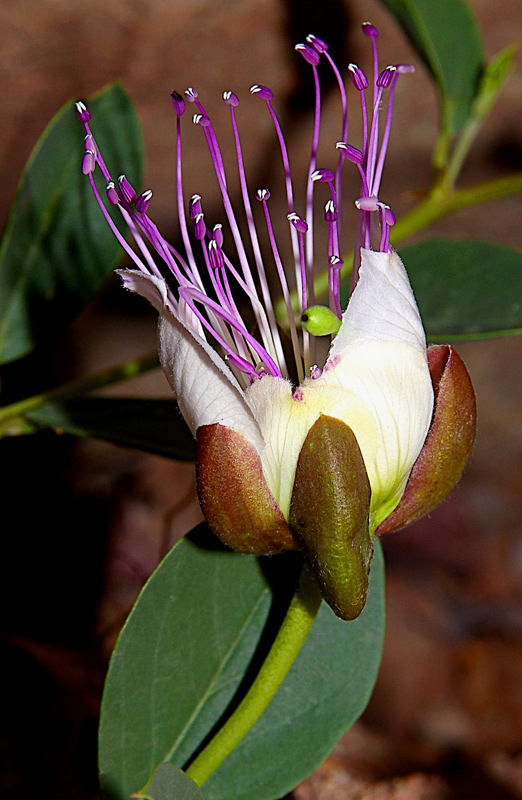 Nombres Familia: Cappariaceae El alcaparro (Capparis spinosa) es un arbusto originario de la región mediterránea, más conocido por sus capullos comestibles, las alcaparras, que normalmente se consumen encurtidas. Con ramas colgantes que pueden alcanzar 1 m o más de longitud, posee hojas gruesas y redondeadas. Las ramas poseen unas afiladas y leñosas espinas, de hasta un centímetro de largas, estas hacen muy penosa la labor de recolección de los alcaparrones o de las alcaparras y le da nombre a la planta. Las llamativas flores de color blanco y con largos estambres nacen en las intersecciones de las hojas con el tallo, sostenidas por pedúnculos regulares. La alcaparra florece a partir del mes de mayo. Con fines medicinales se