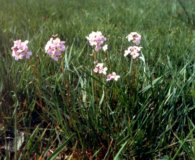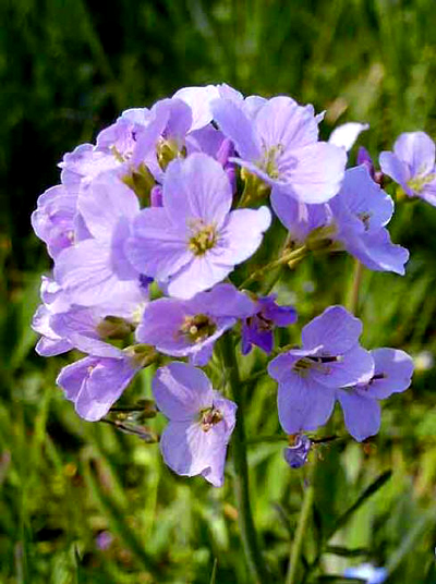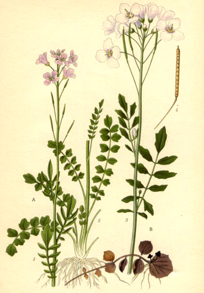 pratensis L. Familia: Crucíferas/brasicáceas Su hábitat: se encuentra en el norte de España y suele halalrse en prados húmedos, orillas de rios y arroyos. Parte medicinal utilizada: Hojas y tallos Tipo de planta: planta vivaz de raíces horizontales cuyos nudos presentan varias raíces de las cuales salen varios vástagos a ras del suelo. Sus hojas son de color verde oscuro, imparipinnadas, con 3/5 foliolos redondeados. Sus tallos son huecos y de forma redondeada. Sus flores se agrupan en ramilletes. Cada flor posee un peciolo, cuatro pétalos de color violeta que a veces son blancos, y en el centro los estambres de color amarillo intenso. La floración se produce en los meses de abril hasta junio.